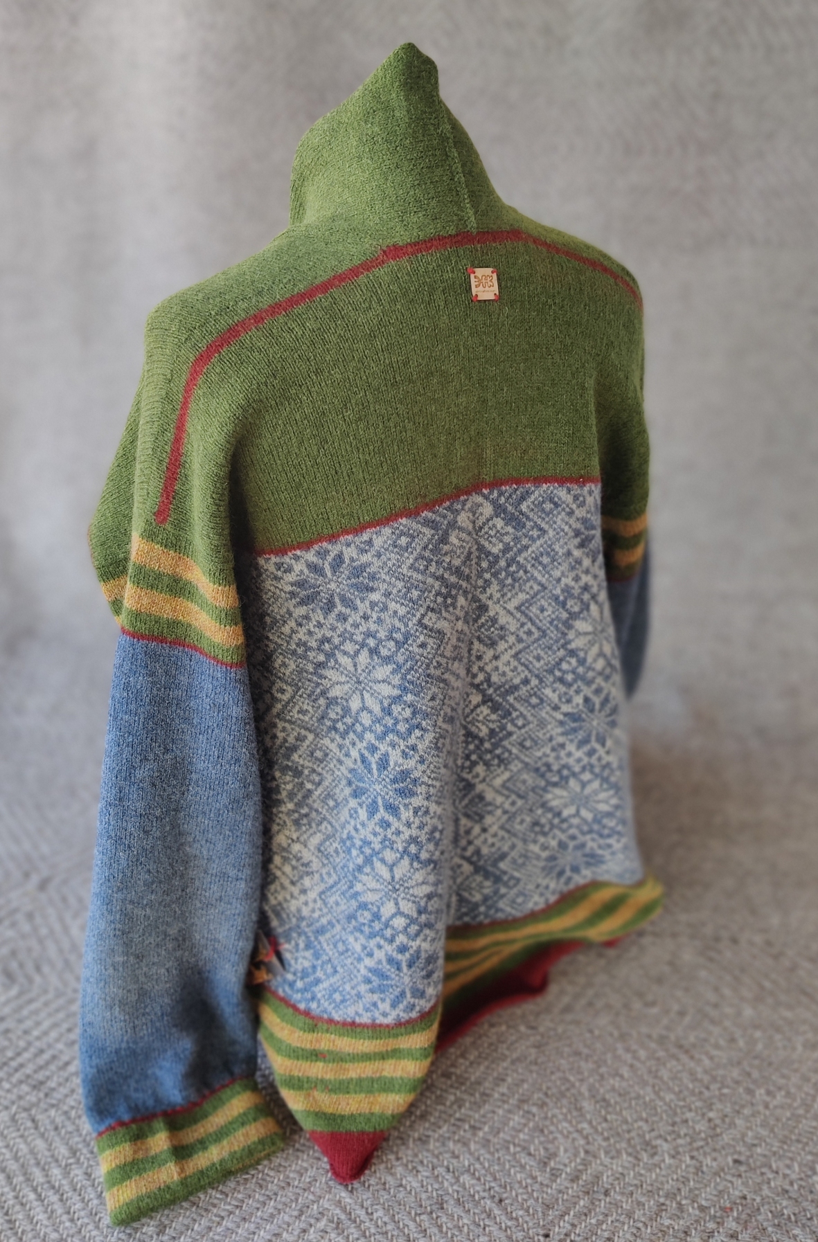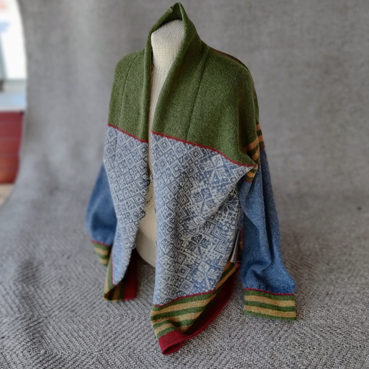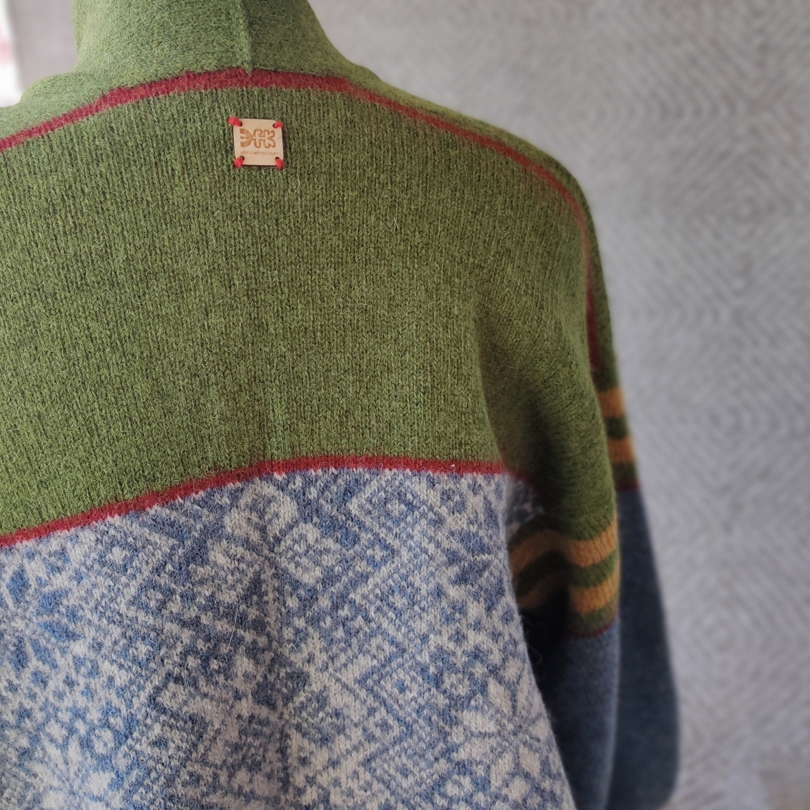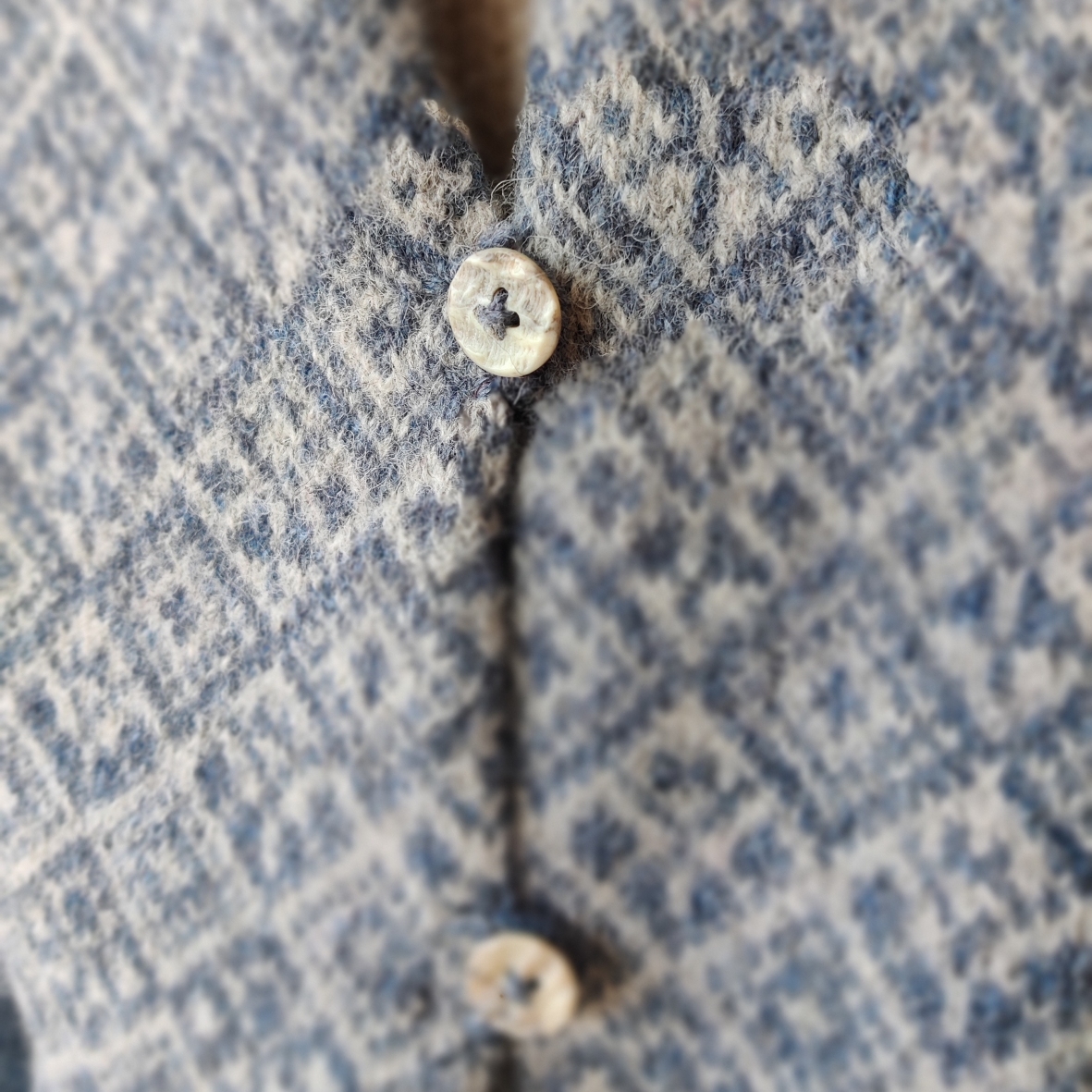Nejlika Cardigan is a loose, longer cardigan knitted in Shetland wool and soft lambswool. The cardigan has a shawl collar with buttons along the front. Insides of sleeve cuffs are knitted in softer lambswool to prevent itchy wrists, and folded with hand stitching.