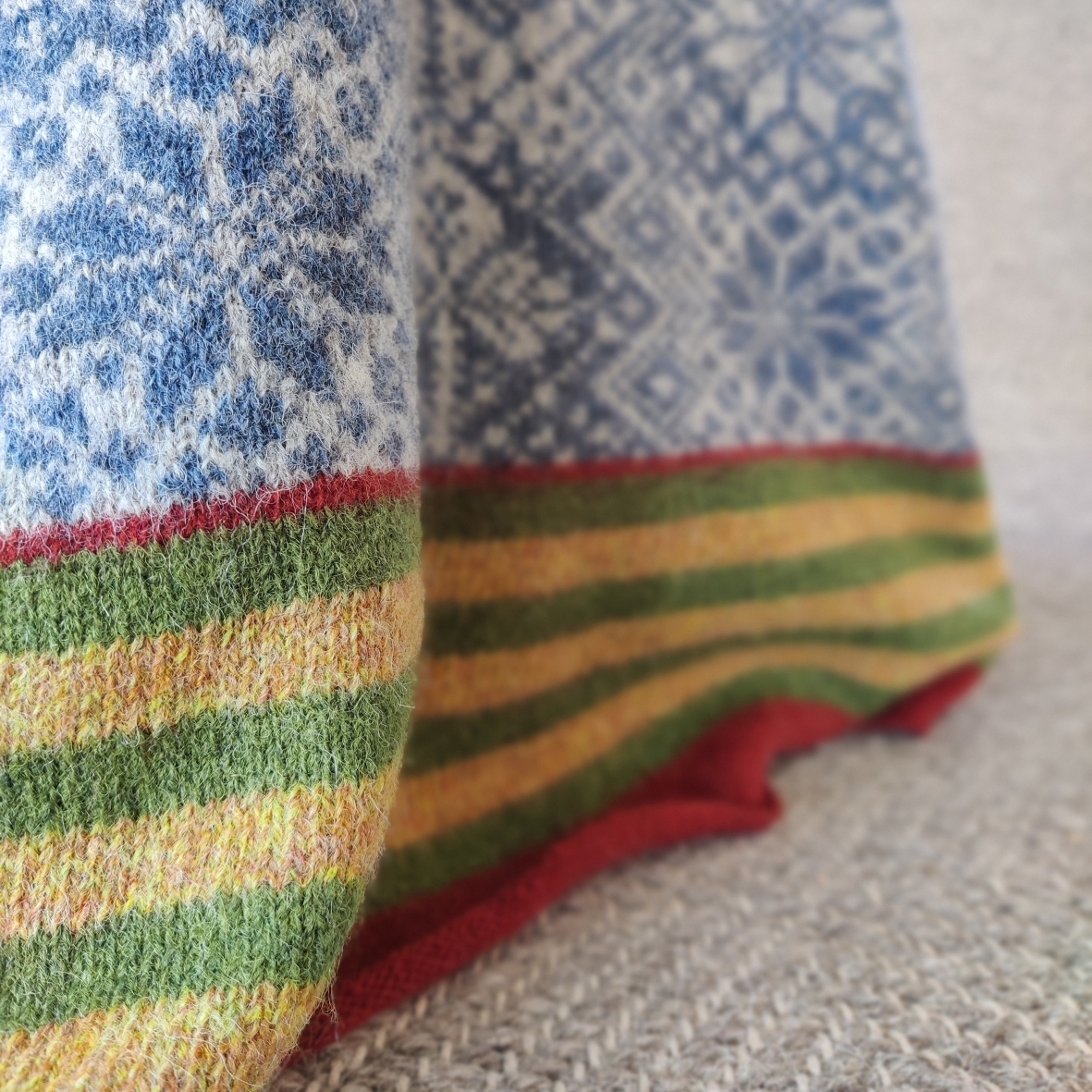 This pattern is inspired by a visit to Edsbyn Museum, about 20 minutes away from my new hometown in Hälsingland. “Nejlika” translates to “carnation” in English and is a common flower to use in knitted and woven patterns in the area. In the Museum you can find a few short jackets – the body sewn in woven wool fabric and the sleeves finely knitted and patterned with carnations. This way, an expensive jacket could be repaired when worn out – you just knit new sleeves!